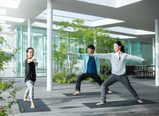 長崎の朝の景色を一望するテラスで メディテーション 本館3階のテラスにて、ヨガインストラクターによるヨガのセッションが受けられます。準備は動きやすい服装のみでOK。 長崎の景色を一望するテラスで、ゆっくりと深呼吸。 心も体もリラックスさせ、安らぎをもたらす時間です。